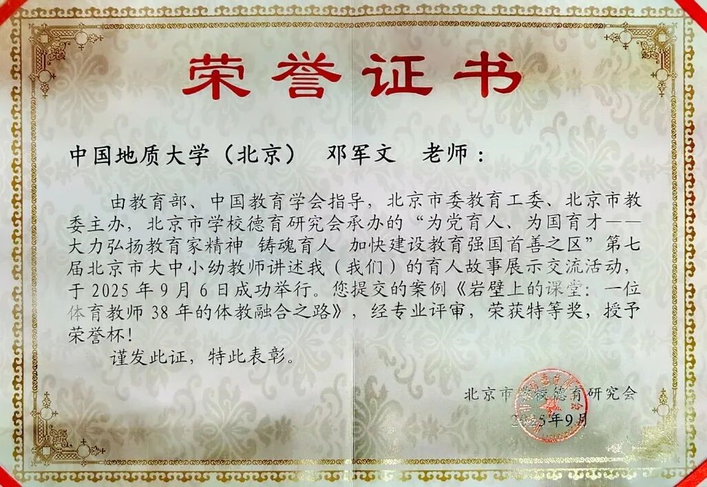 日前,“为党育人、为国育才——大力弘扬教育家精神 铸魂育人 加快建设教育强国首善之区”第七届北京市大中小幼教师讲述我(我们)的育人故事展示交流活动举行,我校邓军文副教授的育人故事《岩壁上的课堂:一位体育教师38年的体教融合之路》荣获特等奖。此次获奖,彰显了我校教师在育人实践中的扎实成效,也激励着全体师生继续追求卓越,深耕育人沃土,为培养担当民族复兴大任的时代新人续写华章。
